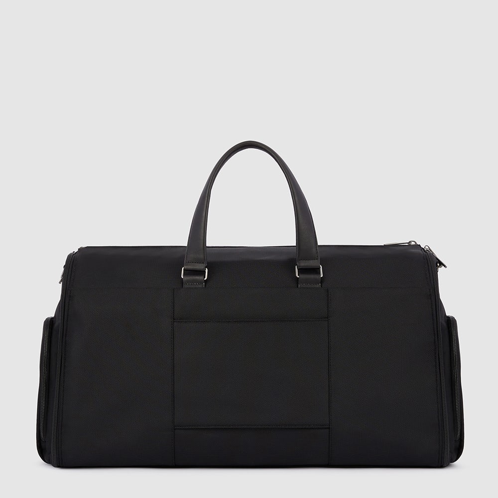 Hanging garment duffel bag in recycled textile and leather with shoe compartment, laundry bag and trolley strap