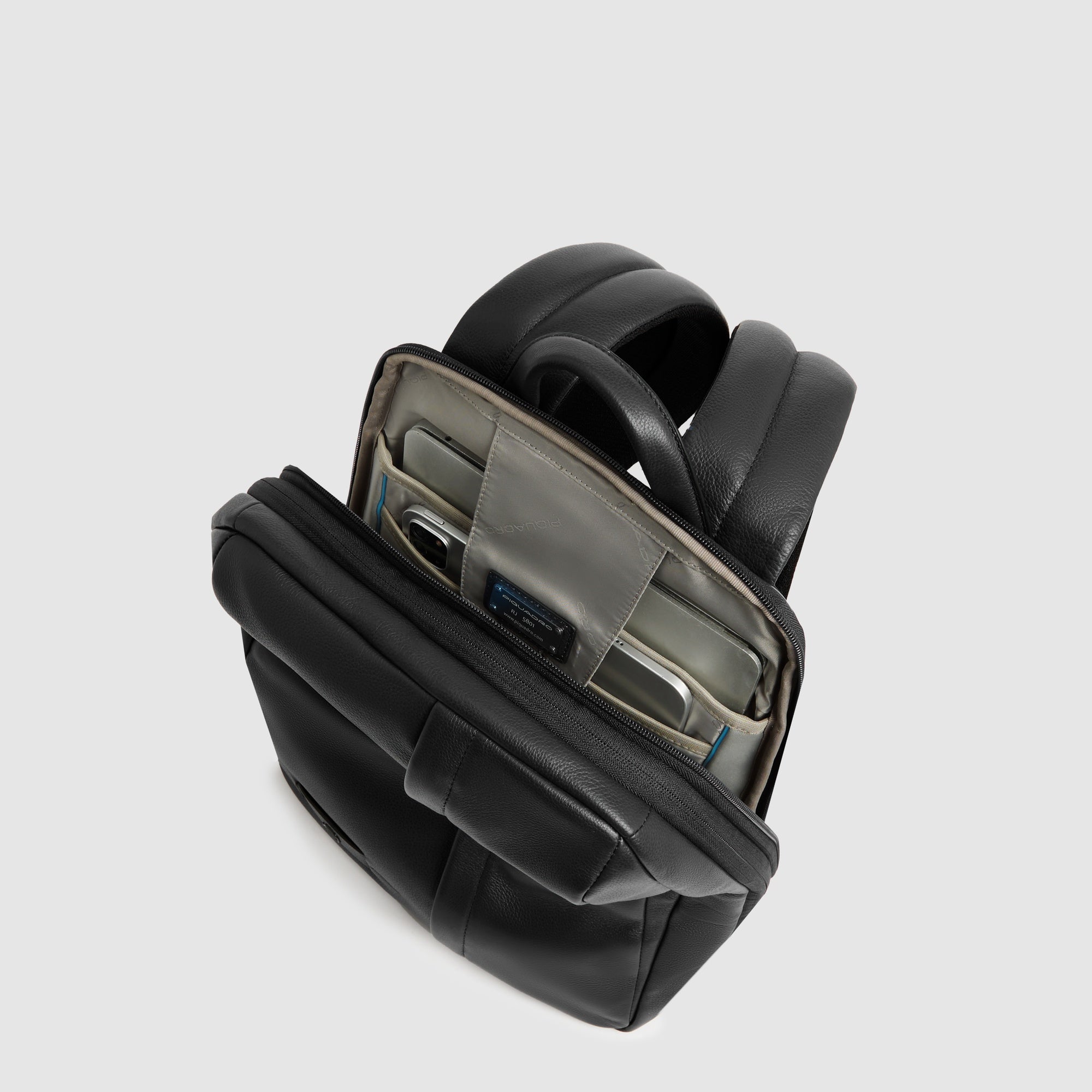 Expandable, leather laptop backpack with iPad® compartment, security system, glasses holder, RFID and shock-absorbing protection