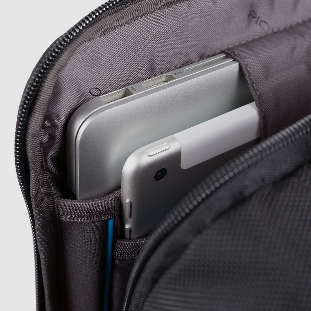 The Brief line is made in vegetable-tanned full-grain calfskin with an irregular appearance given by the hand washing process combined with a water-resistant technical fabric. All models are embellished and finished with design metal accessories featuring double gunmetal grey finish with brushed metal insert stamped with the Piquadro logo.